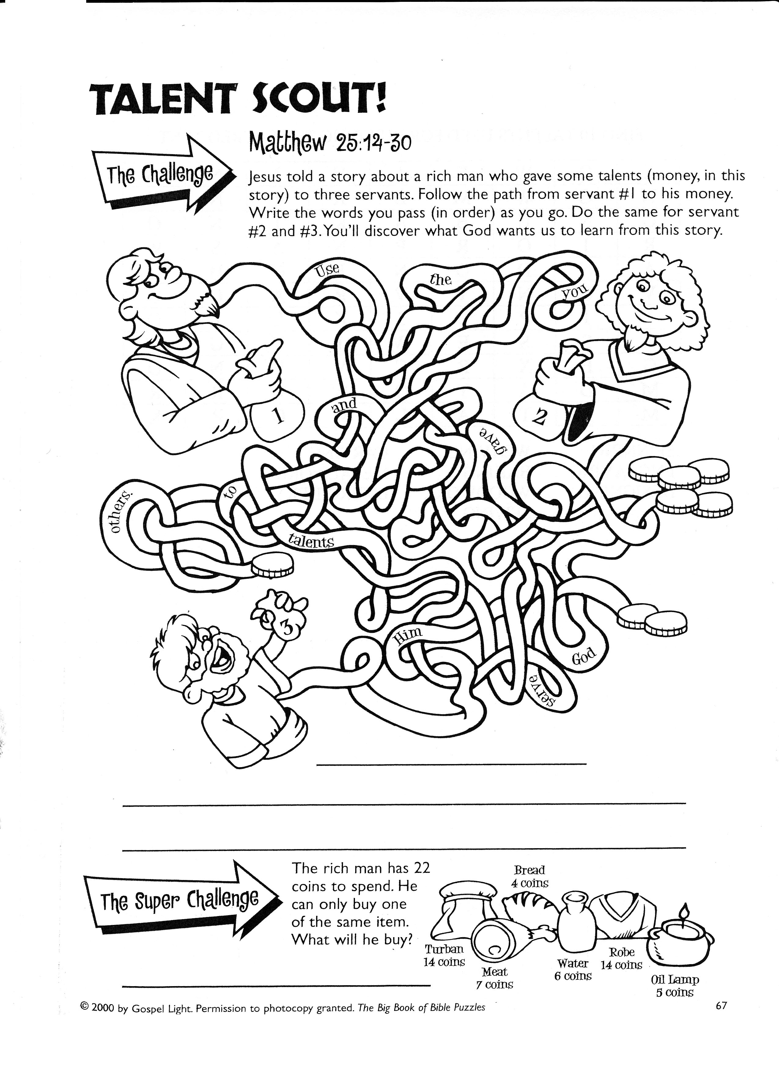 MONEY Given out to the servants, and returned to the Rich Man. It should look good : we used "Gold" coins ( ours were made of chocolate with "gold" wrappers, and appropriately disposed of after the service ). Some "coins" ( 1, 2, and 5 ) are in the bags given to the servants, and there is extra money ready to add to two of the bags.