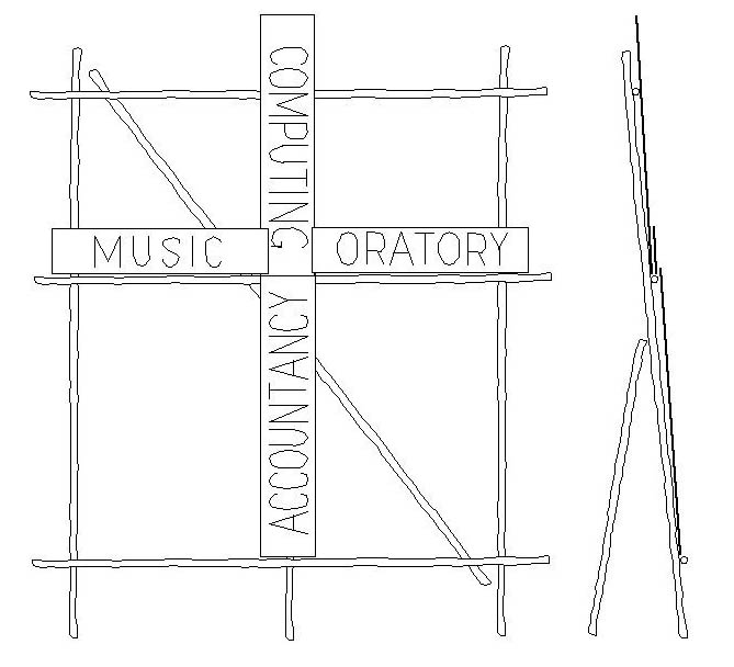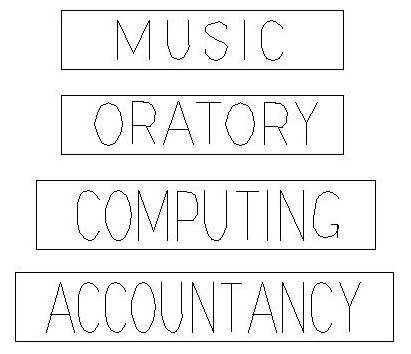 Picture of the four placards; four rectangles bearing the words MUSIC, ORATORY, COMPUTING, and ACCOUNTANCY.