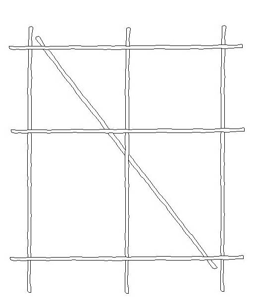 The stand was of bamboo poles, lightly tied together with thin wire through holes bored at the crossing points, with a diagonal for rigidity. It was supported on the trolley by two bamboo legs ( shown in the second picture following ), also anchored with thin wire.
