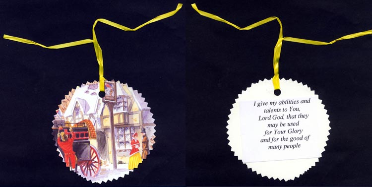 CARDS Each of the programmes given to those in the congregation included a small card, to be hung on the small tree during the service as an indication of the people's desire to offer their talents to God. The cards were cut from old Christmas cards - circles about 7cm diameter with this statement on the back : "I give my abilities and talents to You, Lord God, that they may be used for Your Glory and for the good of many people"; to each card was attached a looped ribbon to hang it on the tree.