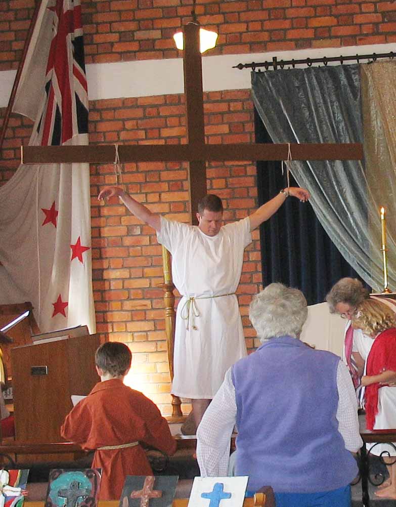 | We used our usual cross. As Jesus spends quite a long time in the crucified position with outstretched arms, we attached loops to the arm of the cross to give support. ( Click the picture for a separate version. No, the loops aren't realistic, but neither is Jesus's wrist watch, which we didn't notice until we looked at the photograph. )