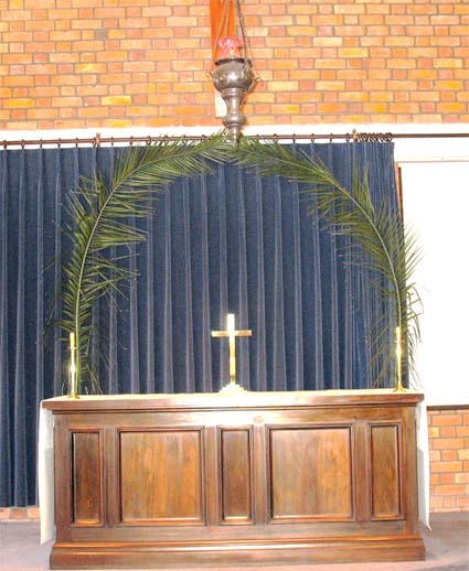 PALM BRANCHES These are standard features of our Palm Sunday decoration in the church. They are good-sized ( 3-4 m ) fronds from a Phoenix palm formed into two arches, one behind the altar and one at the back of the church. The picture illustrates the idea; we usually have significantly more vigorous branches, but these were the best we could manage this year.