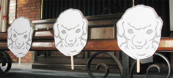 • Sheep faces mounted on stirrer sticks for sheep ready near front to stick on altar rail organ side during procession.