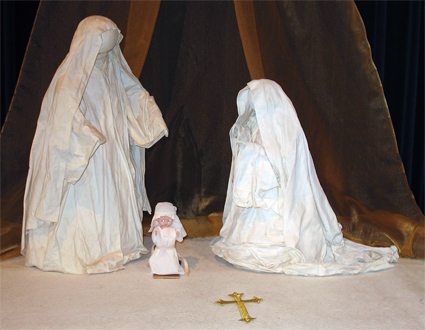There were originally two figures, representing Mary and Joseph, made from papier maché. We don't know where they came from; they had been in our church for a very long time. They are essentially representations of outer garments only, with no attempt to depict details of faces, but they are very effective.