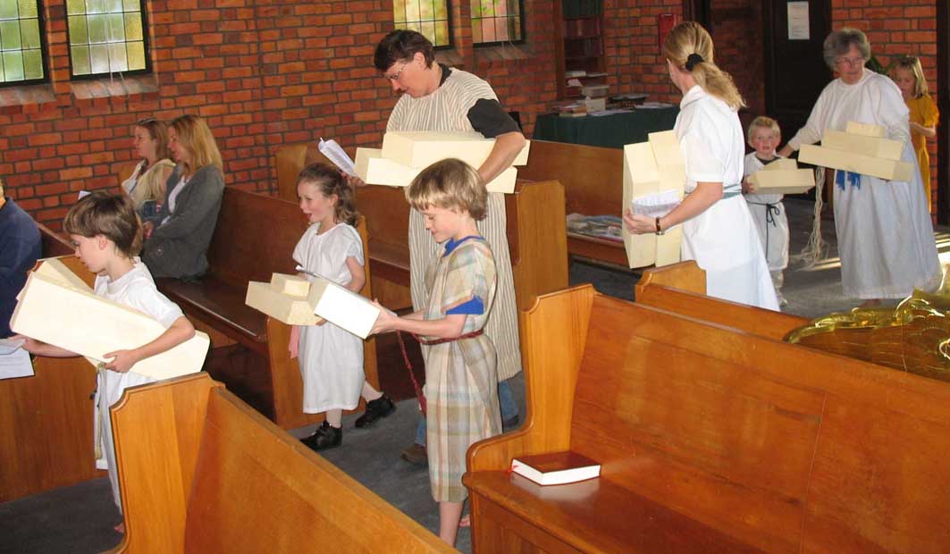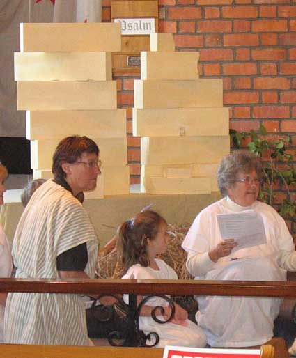 These are polystyrene foam blocks. Some are coloured a light fawn shade ( we painted them so that they looked rather less like polystyrene foam blocks ), and some ( which we acquired later ) are white. They are quite large - up to perhaps 80 × 10 × 20cm  - so you can build a respectably large structure rather quickly.