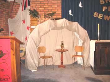 It's a fairly symbolic building, looking rather more like a cave, but it has a "roof" and an interior which can hold a few chairs and a small table, or other limited amount of bits and pieces. In practice, the lack of realism doesn't matter, and it works well. We've used it as a house, and as the stable in Bethlehem. Here's a picture from the 2006 Carol service :