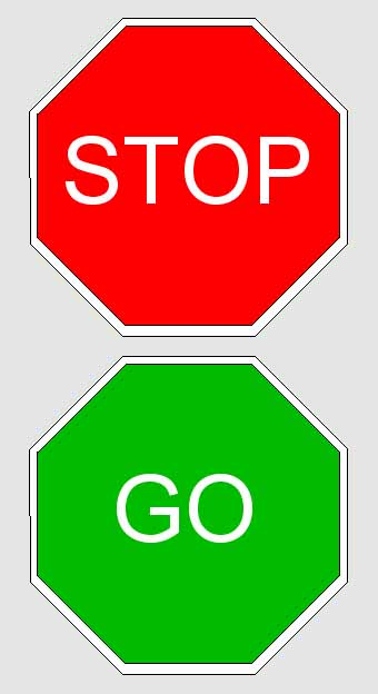 Both sides of the sign.We have had several occasions for calling a sudden halt to events in our services, and the obvious way to do so was to use something like the STOP sign familiar on New Zealand roads. It happened that on the first such occasion we also wanted a corresponding GO sign, so we constructed a double-sided version in the obvious way.