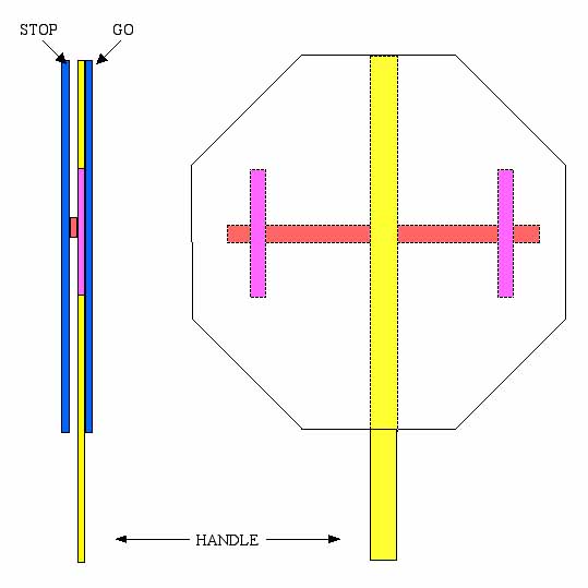 There is nothing particularly clever about it. Perhaps the main feature is its rather sturdy construction, intended mainly to ensure that the sign didn't fall apart when rotated fairly briskly to show alternately STOP and GO signals. The diagram below illustrates our design. It was about 70cm across and mounted on a 1.5m stick. The yellow, pink, and purple bits are wood. ( The colours have no significance; they are intended only to identify the parts in the two views. )