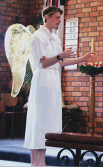 We use the white wings whenever we have several parts for angels, which is quite often. Occasionally we have used both white and gold wings, when the gold wings identify an angel in some sense superior to the others.