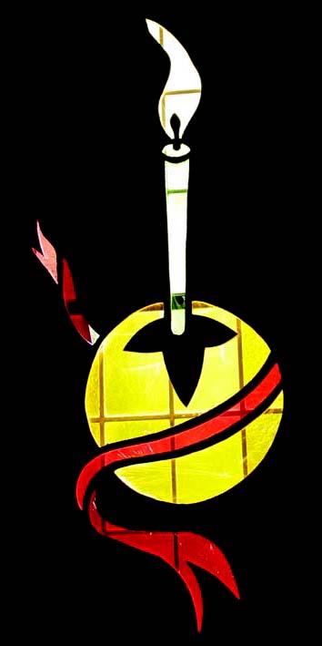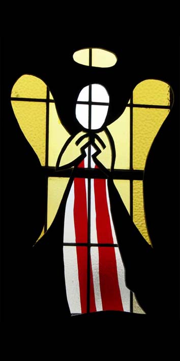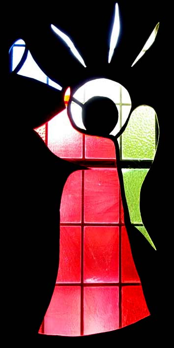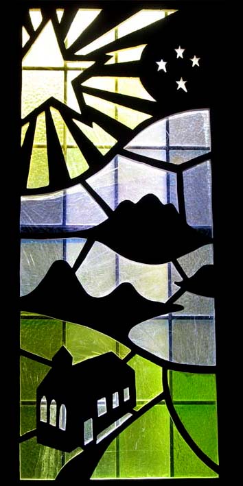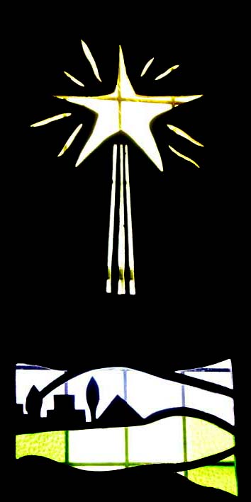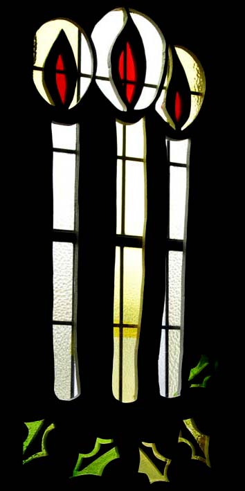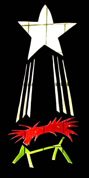 Quite early in the recent history of St. Augustine's, as recorded in this web site, we presented a Christmas service. It was perhaps the first such service for a long time, and we had quite a goodly number of enthusiastic helpers. One of their contributions was to devise and produce a set of overlays for some of our windows, which gave the appearance of stained glass windows, with patterns appropriate for Christmas.